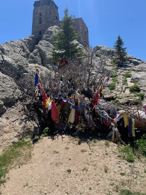 This photo is from the top of Black Elks Peak, Custer State Park, South Dakota. In foreground is Native American prayer flags and in background is a stone built fire tower completed in 1938.